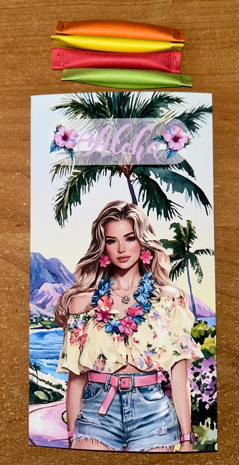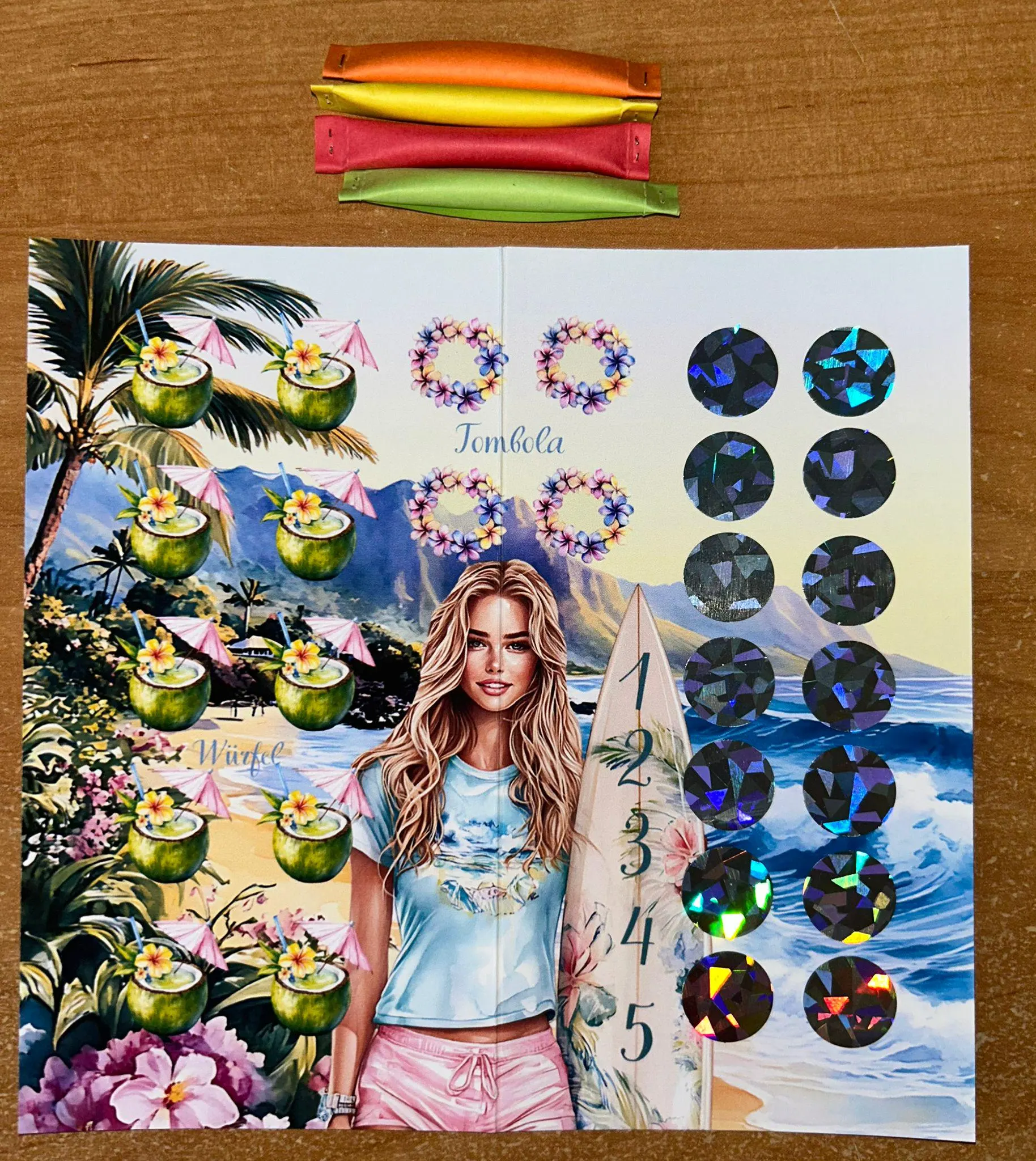Aloha ist eine Klappkarte in A6 Zum Rubbeln, Abstreichen, selber Würfeln und Lose ziehen.