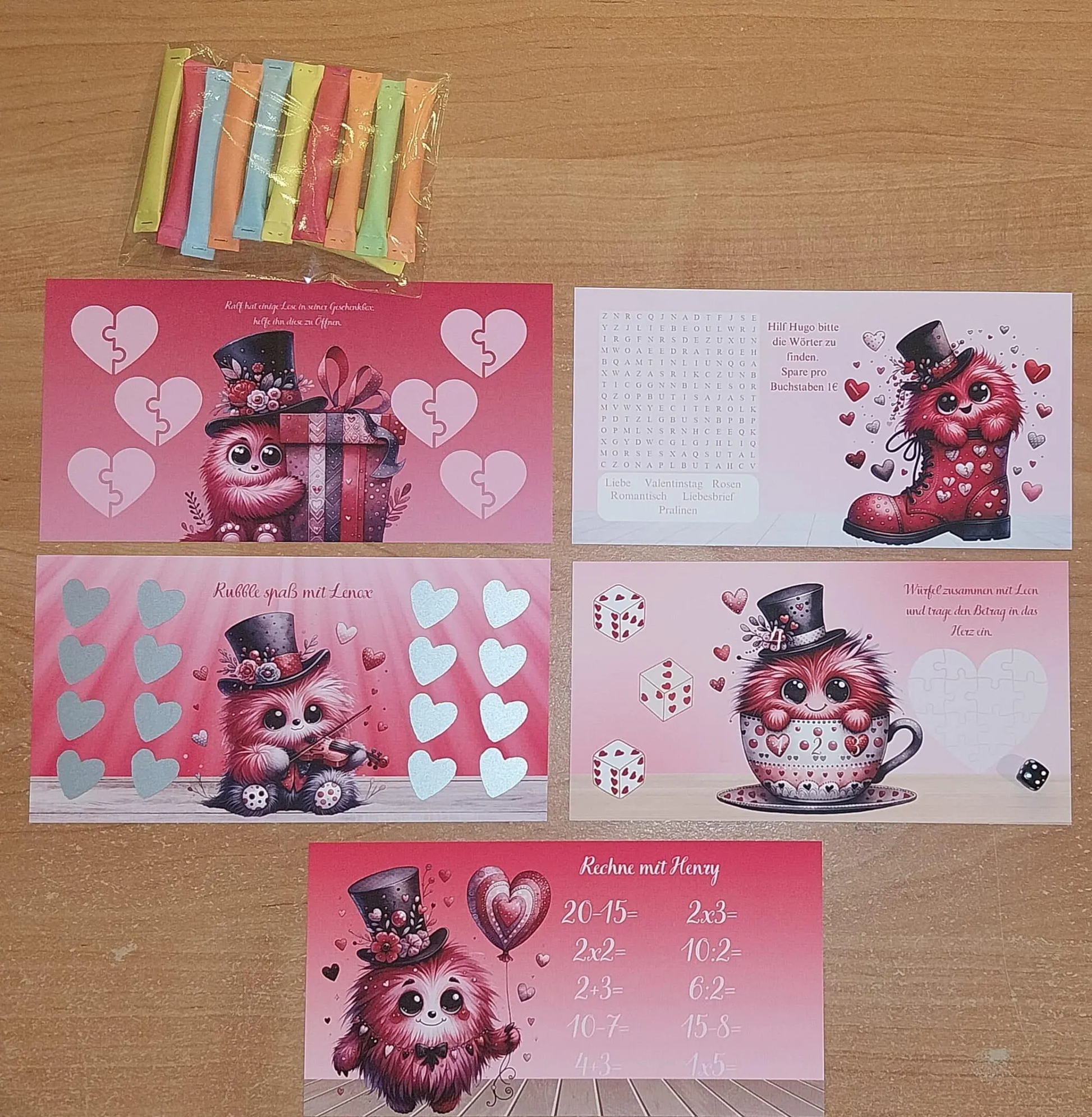 Valentins Monster Challenge reihe bestehend aus 5 Normalen Karten - Hugo: Eine Wörtersuch Abstreich Challenge wo du insgesamt 70€ sparen kannst. - Leon: Eine selber Würfeln Abstreich Challenge wo du insgesamt 47€ + ?€ sparen kannst. - Rubble mit Lenox: Unter den Feldern findest du Beträge von 2€- 4€ zusammen sind es 56€ - Rechnen mit Henry: Zusammen kannst du 50€ sparen - Ziehe Lose mit Ralf : Du bekommst 12 Lose mit Geschickt betrag ist ?€ Mit passemden Tracker auf der Rückseite können eure Beträge gleich eingetragen werden. ** Die Maße und Farben können leicht abweichen, da die Produckte von mir auf einem Tintenstrahldrucker ausgedruckt und manuell zugeschnitten werden. Und nun Wünsche ich euch viel Spaß beim Sparen... :)))) Euer BudegtDrache€