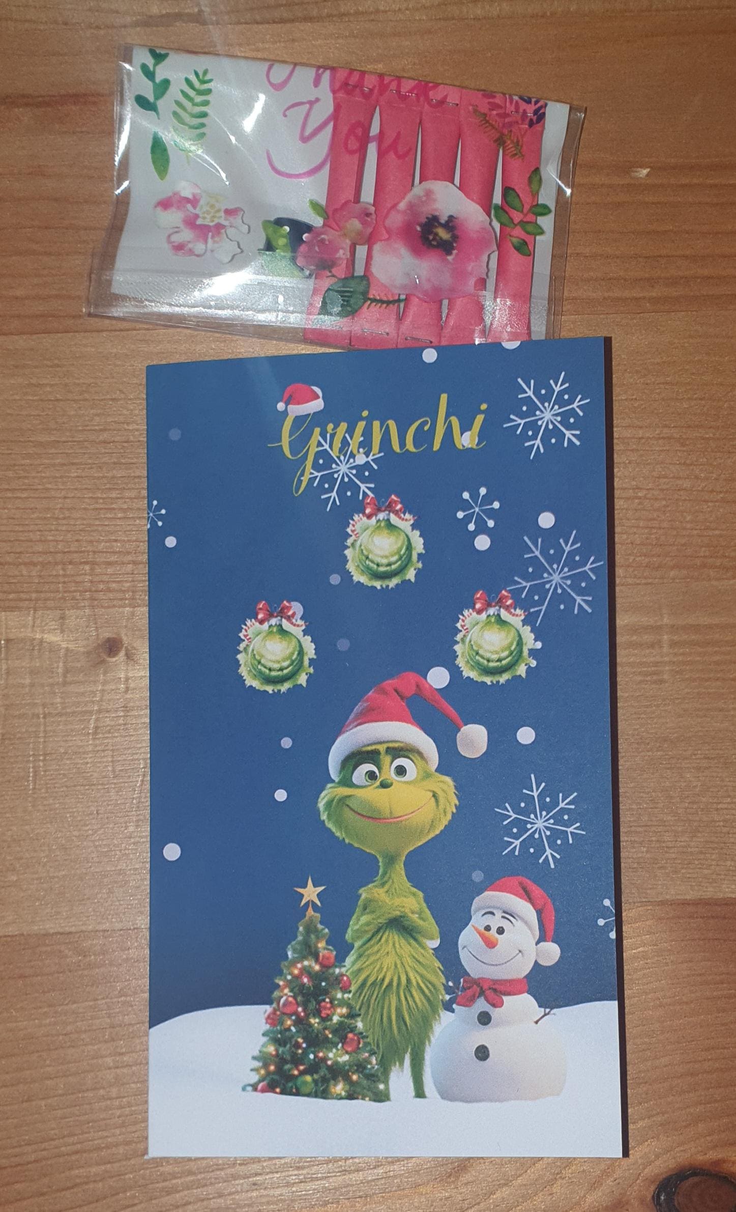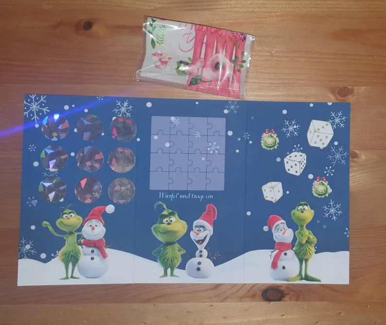Grinchi ist eine 3 Klappkarte in A7 zum Rubbeln, Würfel, Lose und Abstreichen.