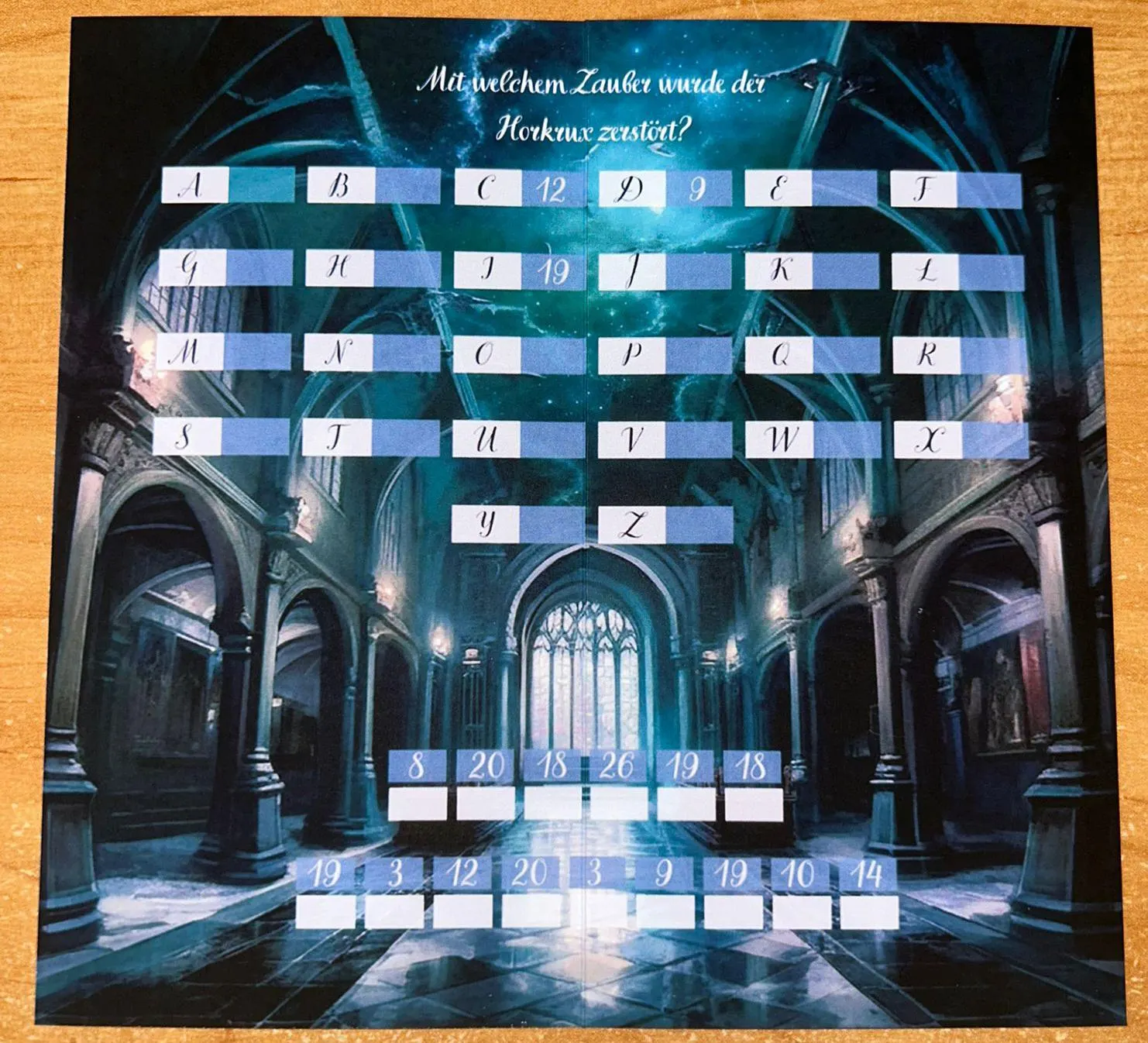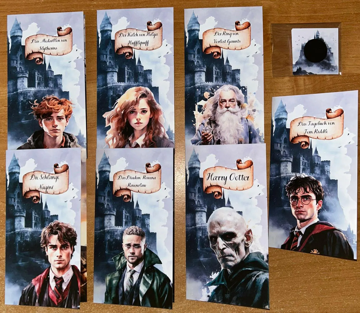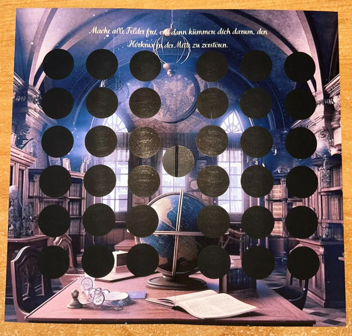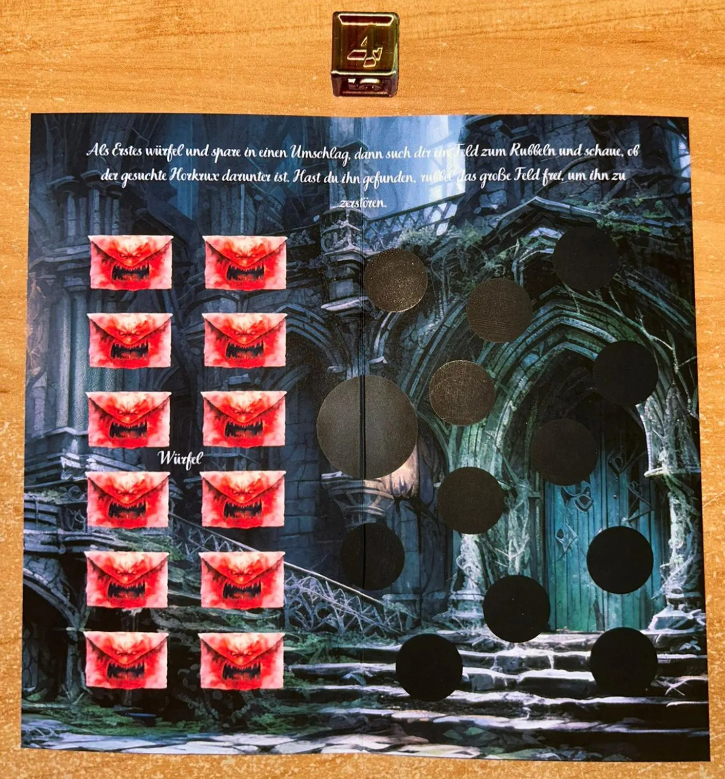 Du bekommt 7 kleine karten darfst dir davon eine aussuchen und dann frei rubbeln, unter den Karten sind die Horkruxe versteckt suche nun nach der Passenden Klappkarte und Zerstöre den Horkrux .