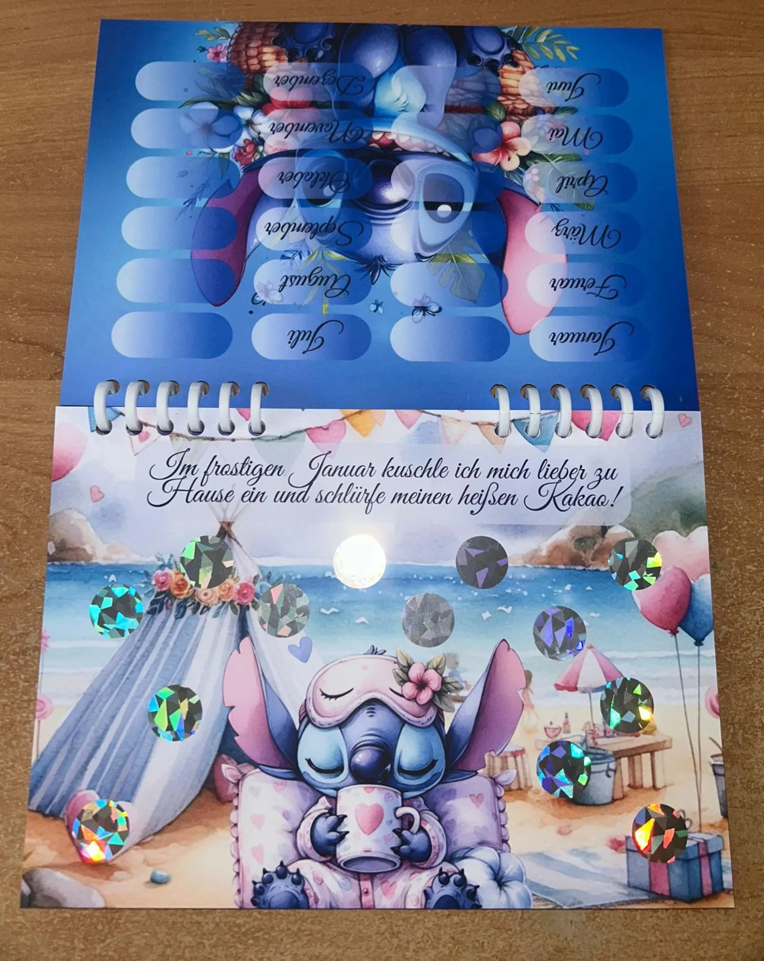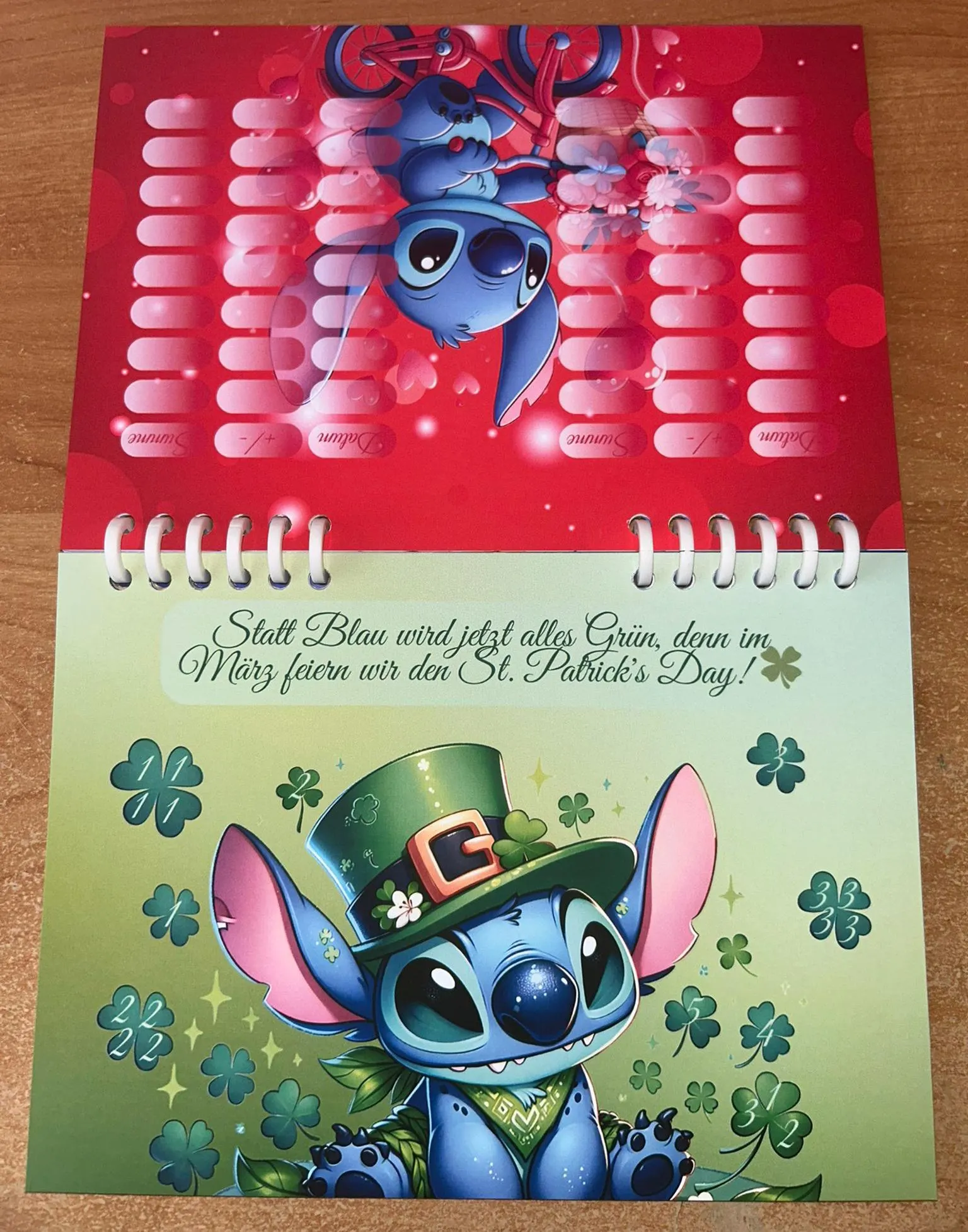 Der Jahreskalender Blauer Alien ist in Format A5 entstanden. Der Kalender hat insgesamt 14 Seiten wo die Erste und Letze Seite matt laminiert sind.