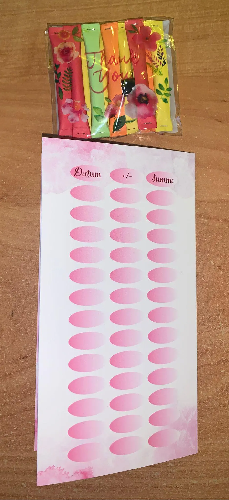 Mit passemden Tracker auf der Rückseite können eure Beträge gleich eingetragen werden.