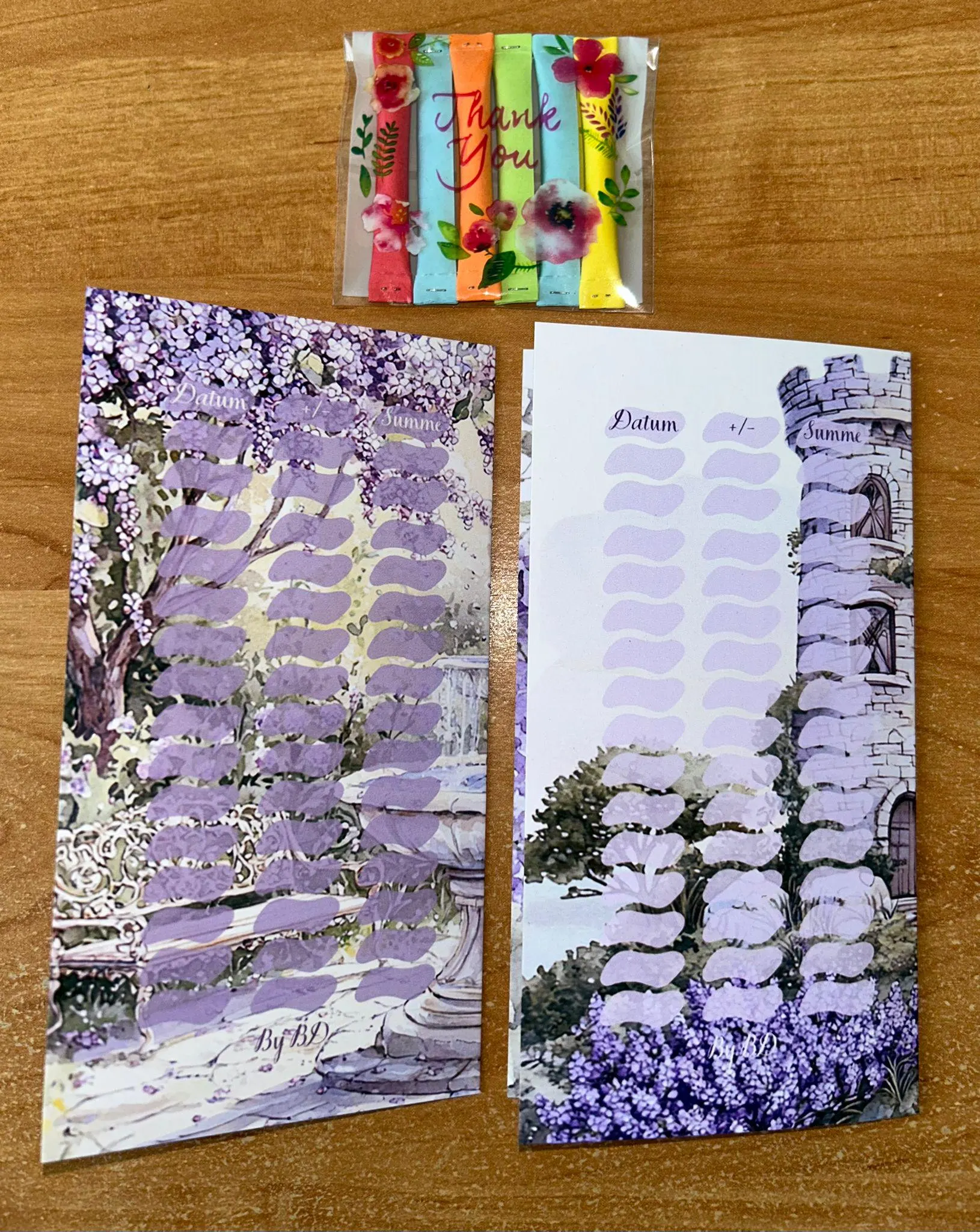 Mit passemden Tracker auf der Rückseite können eure Beträge gleich eingetragen werden.