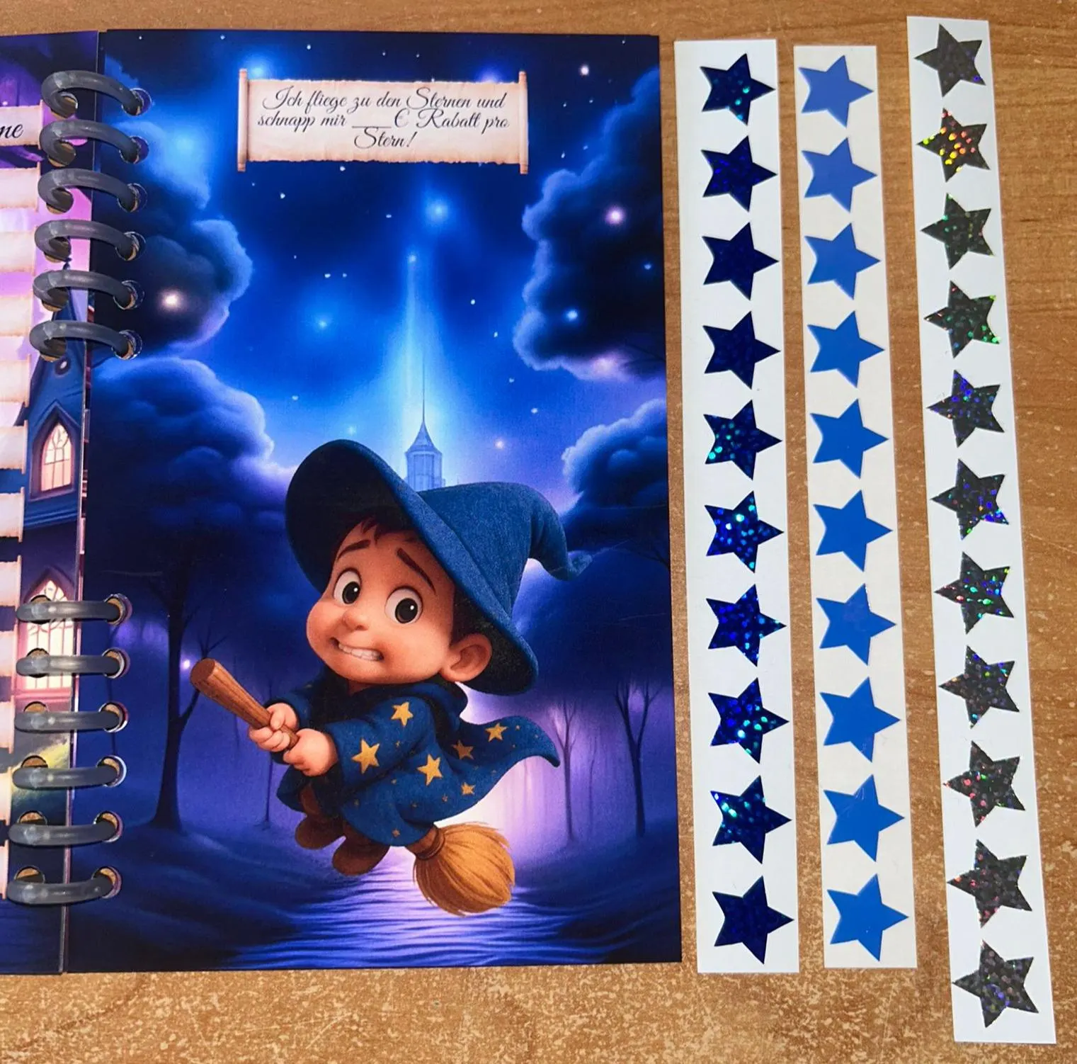 Sparbuch Der kleine Zauberschüler ist in Format A6. Das Buch hat insgesamt 10 Seiten wo die Einleitung und der Abspann Glänzend laminiert sind.