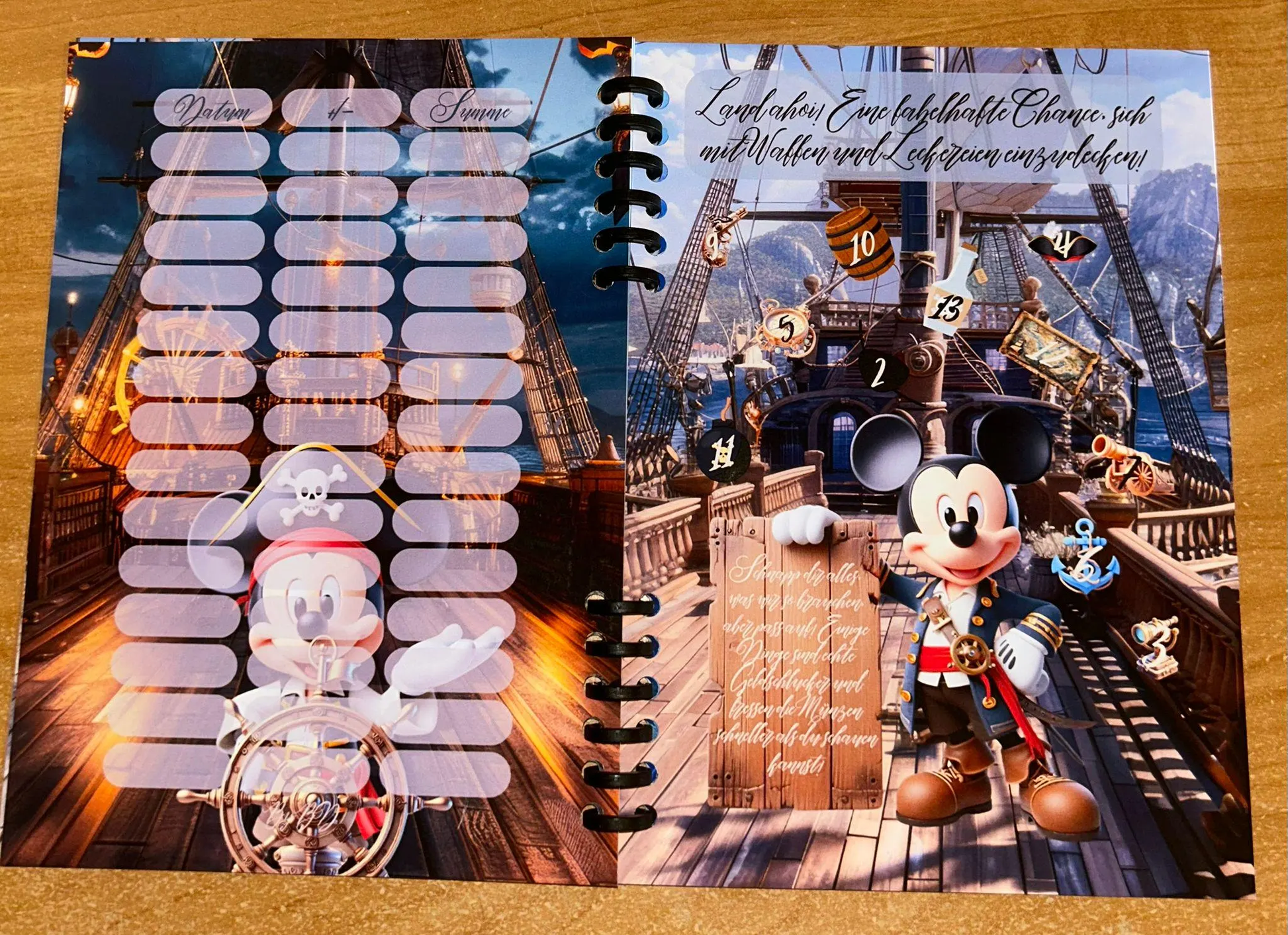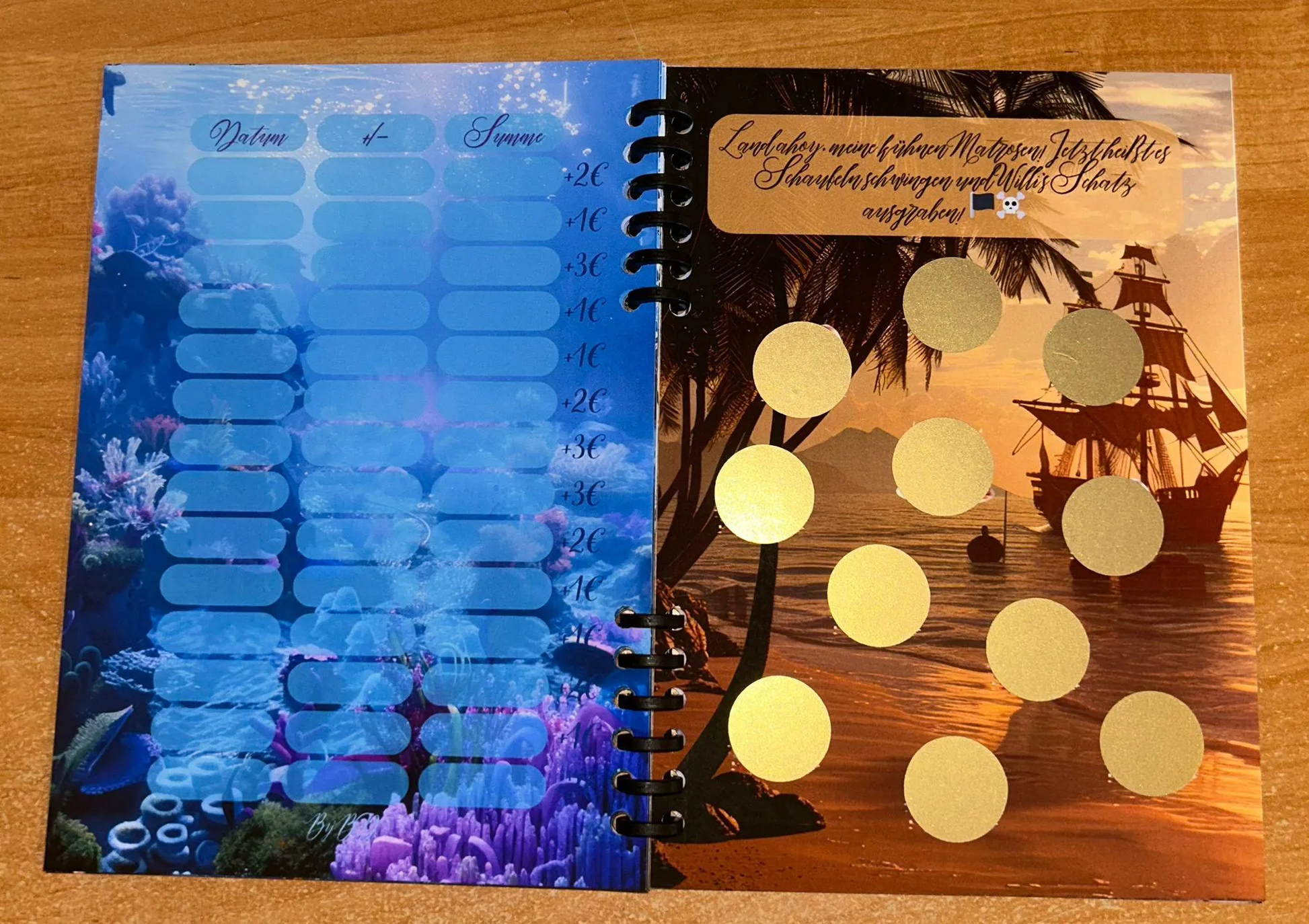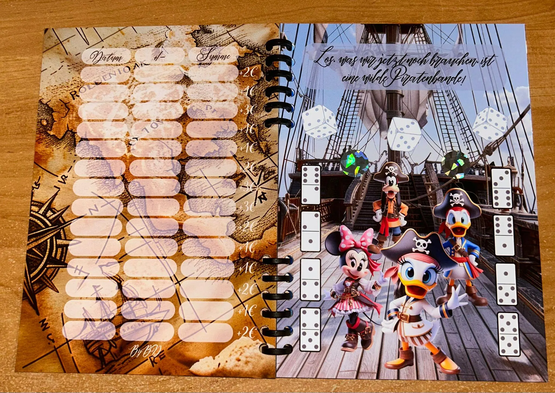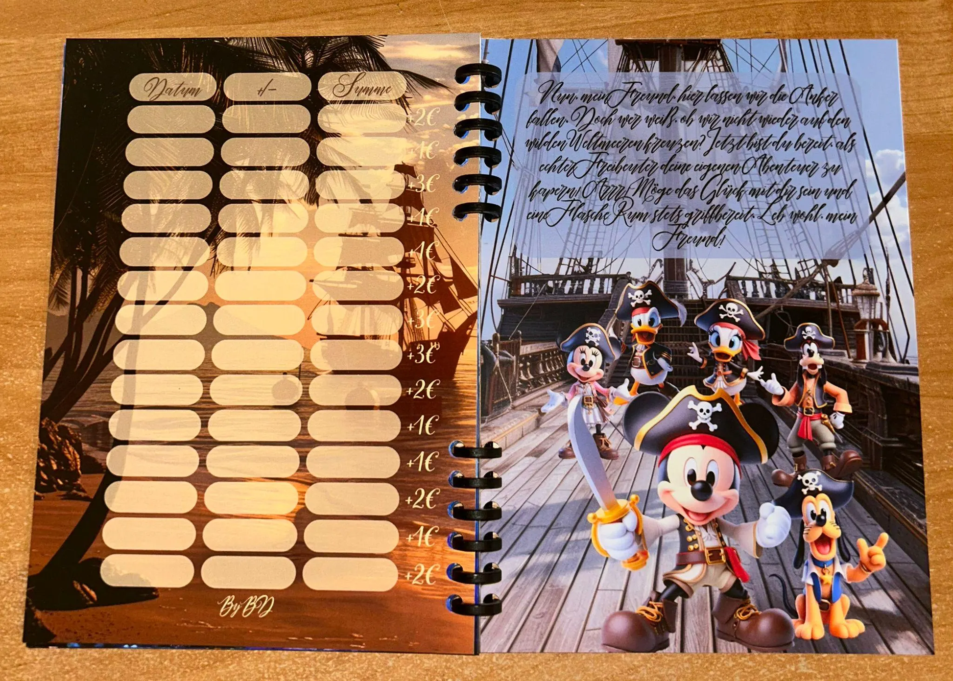 Mein erstes Sparbuch ist in Format A5 entstanden. Das Buch hat insgesamt 9 Seiten wo die Einleitung und der Abspann matt laminiert sind.