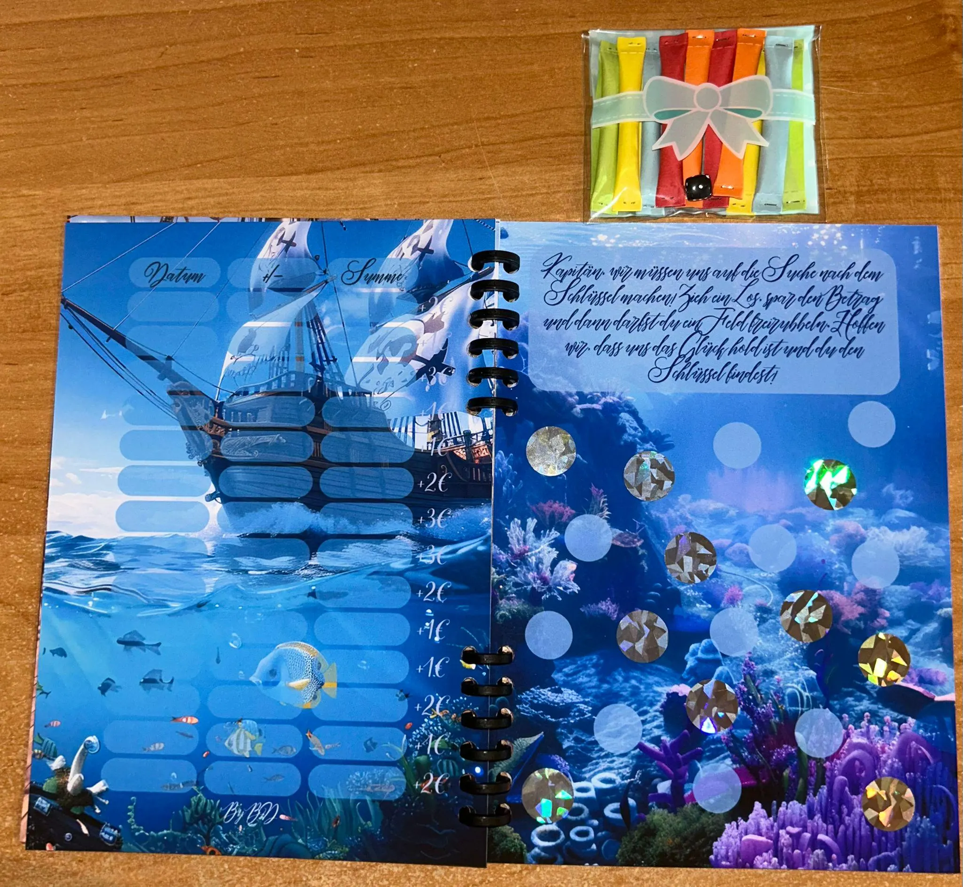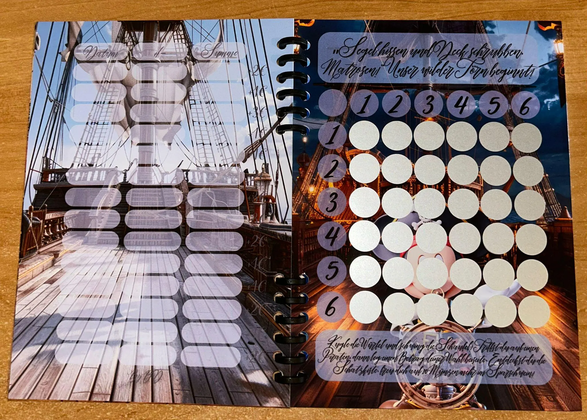 - 7. Seite: Ziehe ein Los und spare den betrag dann such dir ein Feld aus und rubble es frei. Mit Beträgen von 1€-5€ und gesamt Sparbetrag 25€ + ?€ mit 10 Losen.
