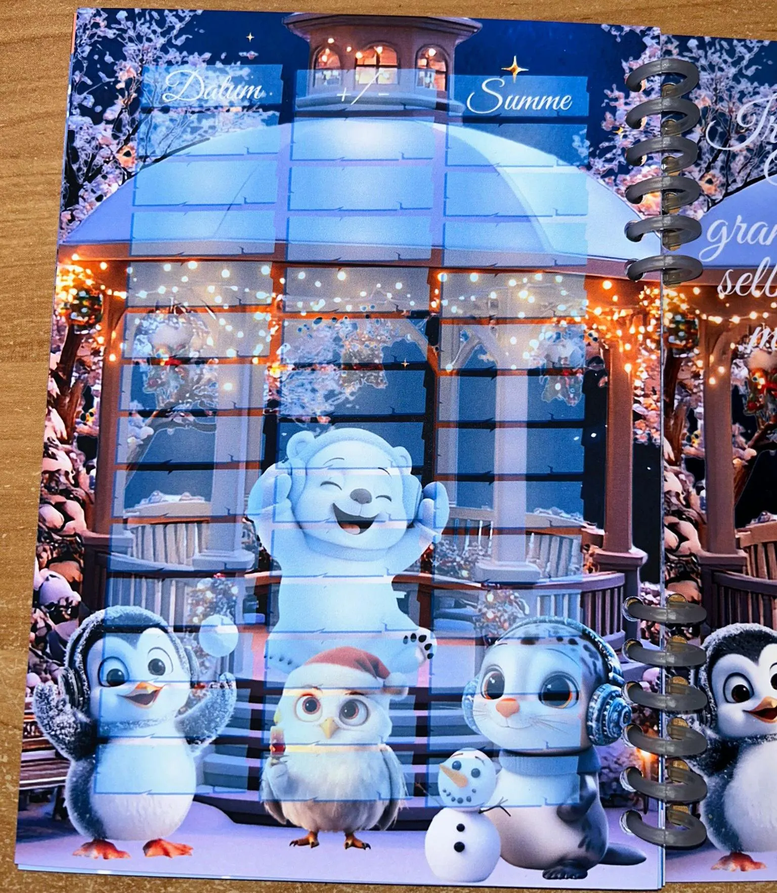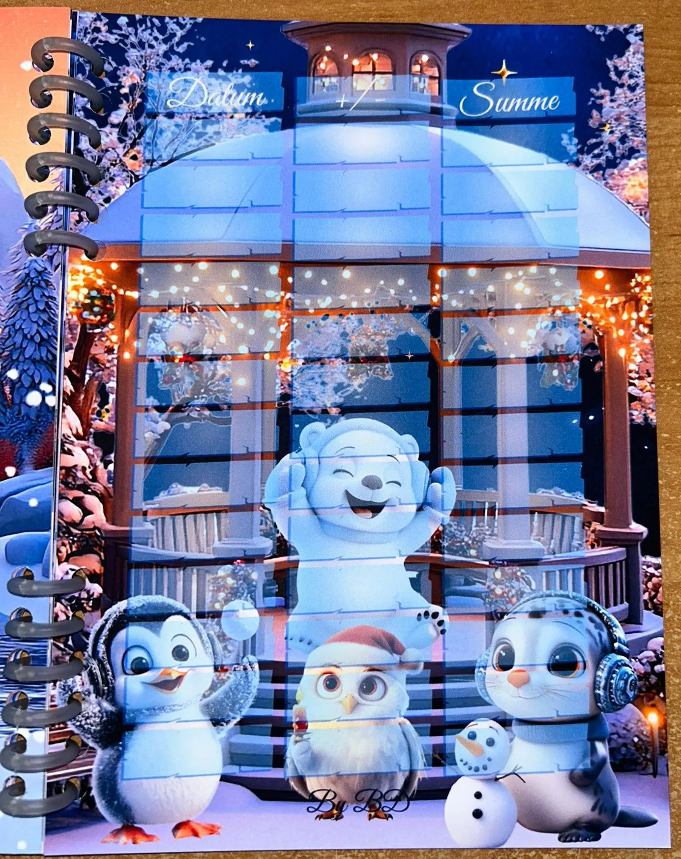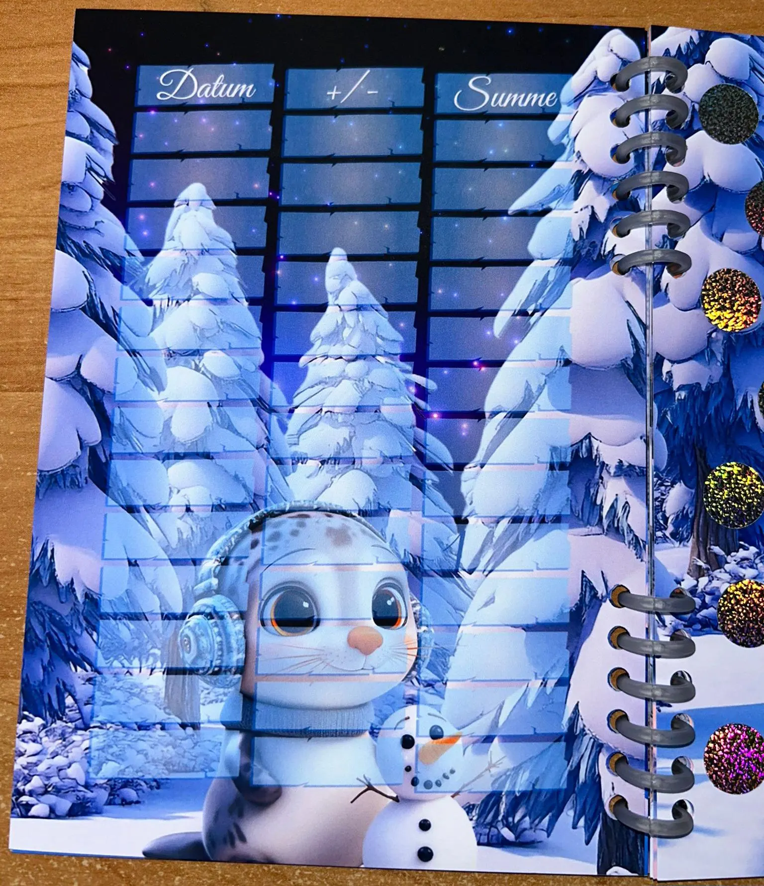 Sparbuch die Wintertierband ist in Format A5. Das Buch hat insgesamt 9 Seiten wovon 1 noch ein Tracker ist. Die Einleitung und der Abspann Glänzend laminiert sind.